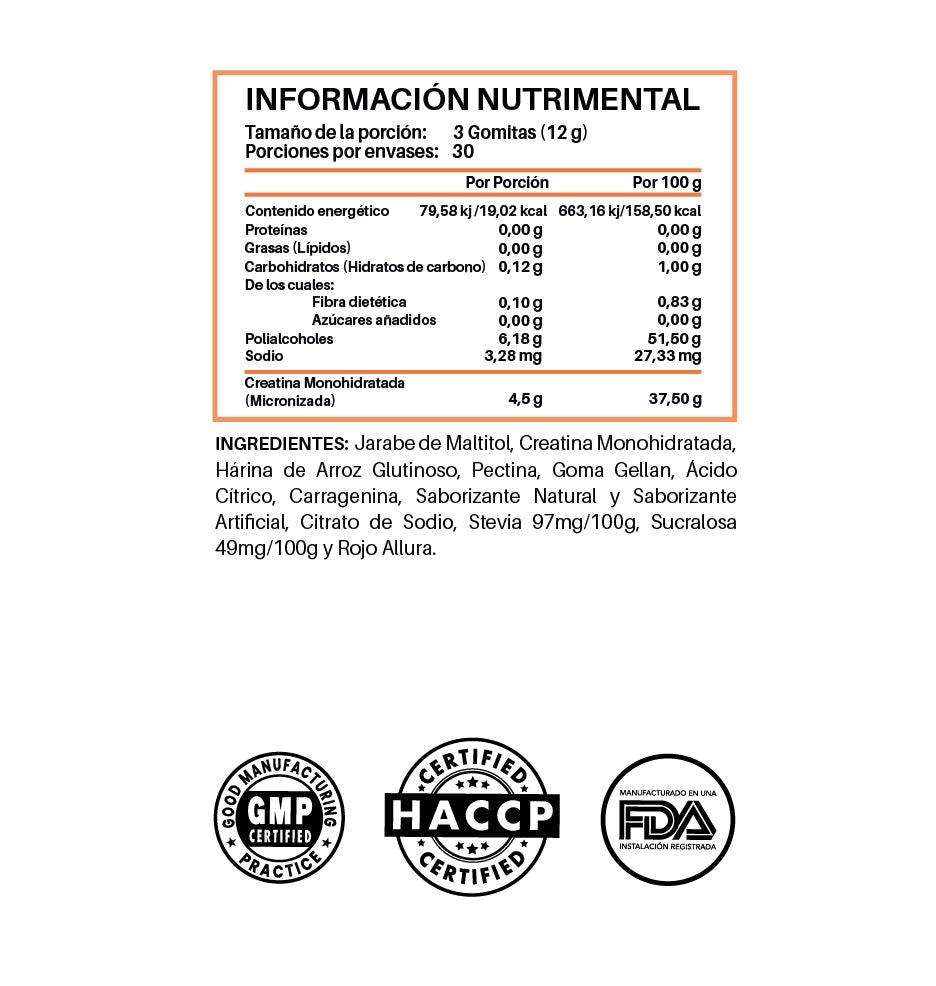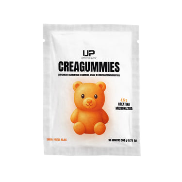 Potencia tu rendimiento y mejora tu fuerza con CREAGUMMIES, el suplemento alimenticio en formato de gomitas a base de creatina monohidratada micronizada. Cada porción (3) aporta 4.5 g de creatina de rápida absorción para maximizar tu energía, resistencia y recuperación muscular.