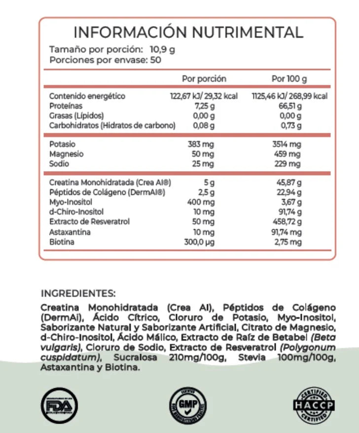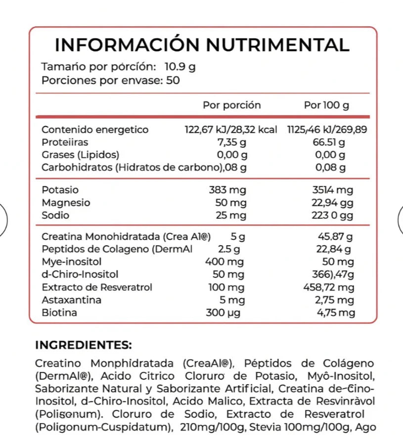 Potencia tu rendimiento y mejora tu recuperación muscular con esta fórmula avanzada que combina 5g de creatina micronizada, 2.5g de péptidos de colágeno y una proporción 40:1 de mezcla de inositol por porción. Ideal para atletas, fitness lovers y cualquier persona que busque fortalecer su desempeño físico y salud articular en una sola toma diaria.
